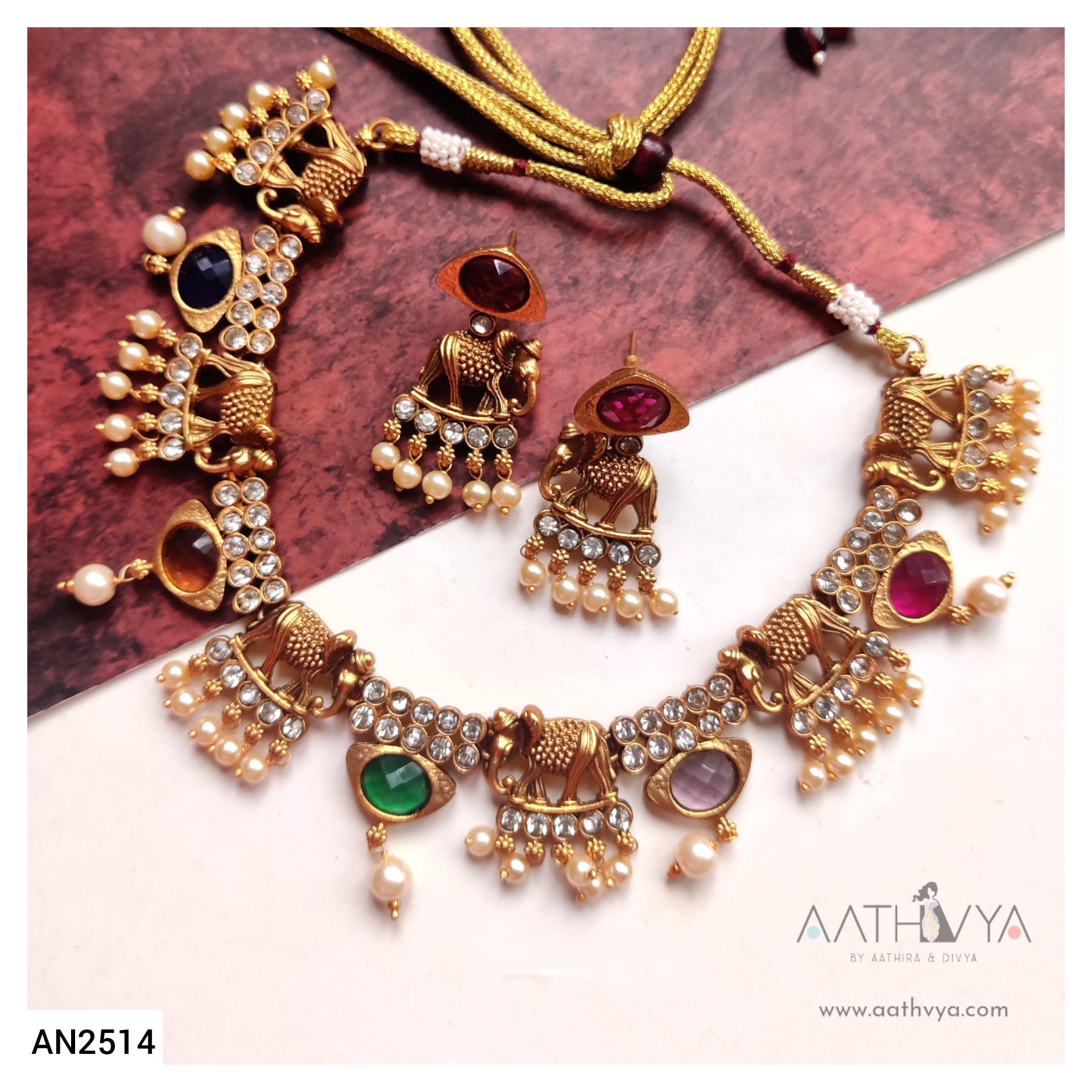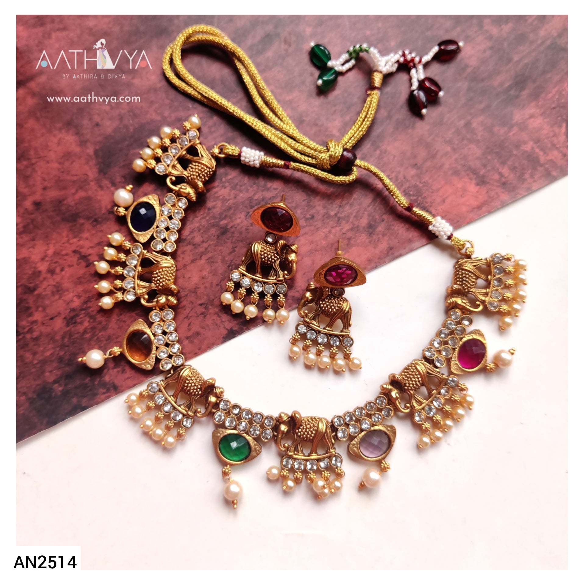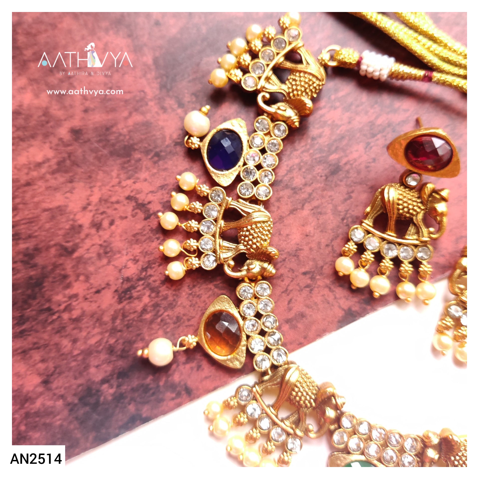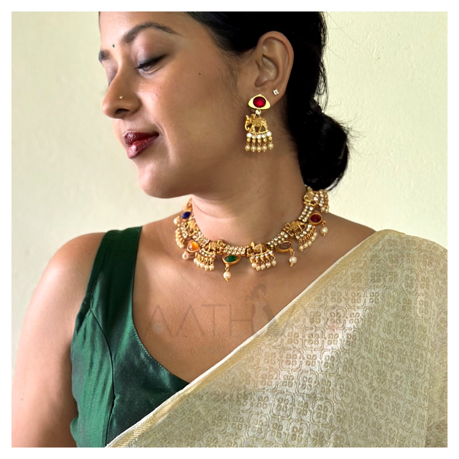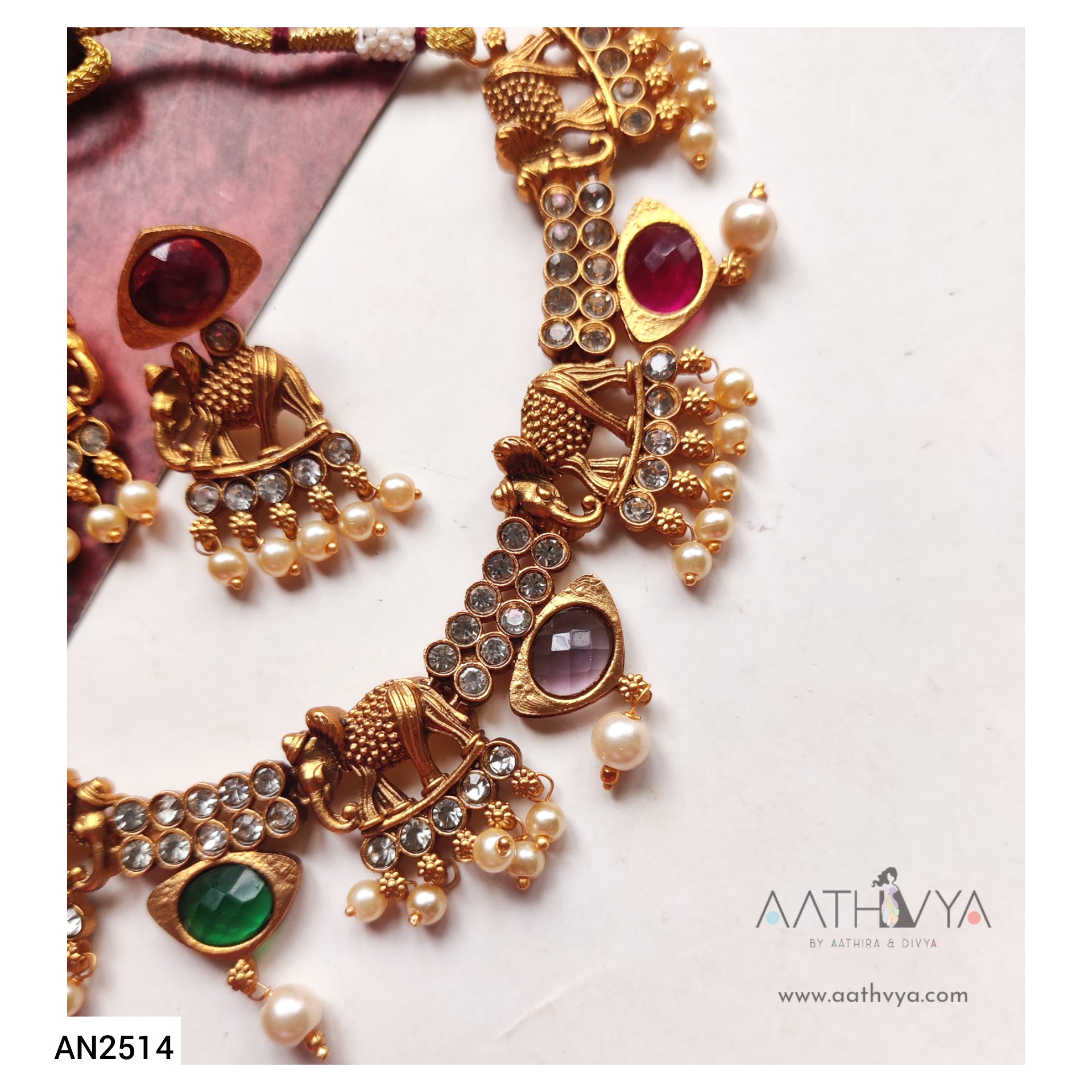 This festive season, adorn yourself with this matte finish, multicoloured stone & off-white pearl bead embellished, intricately handworked, elephant designed necklace set.