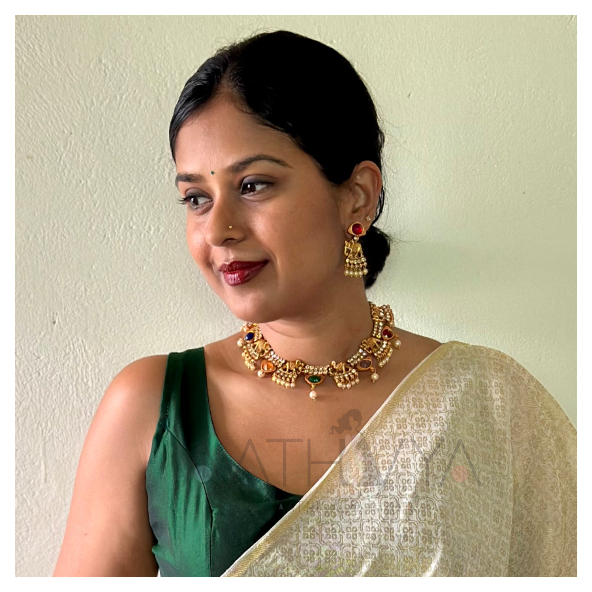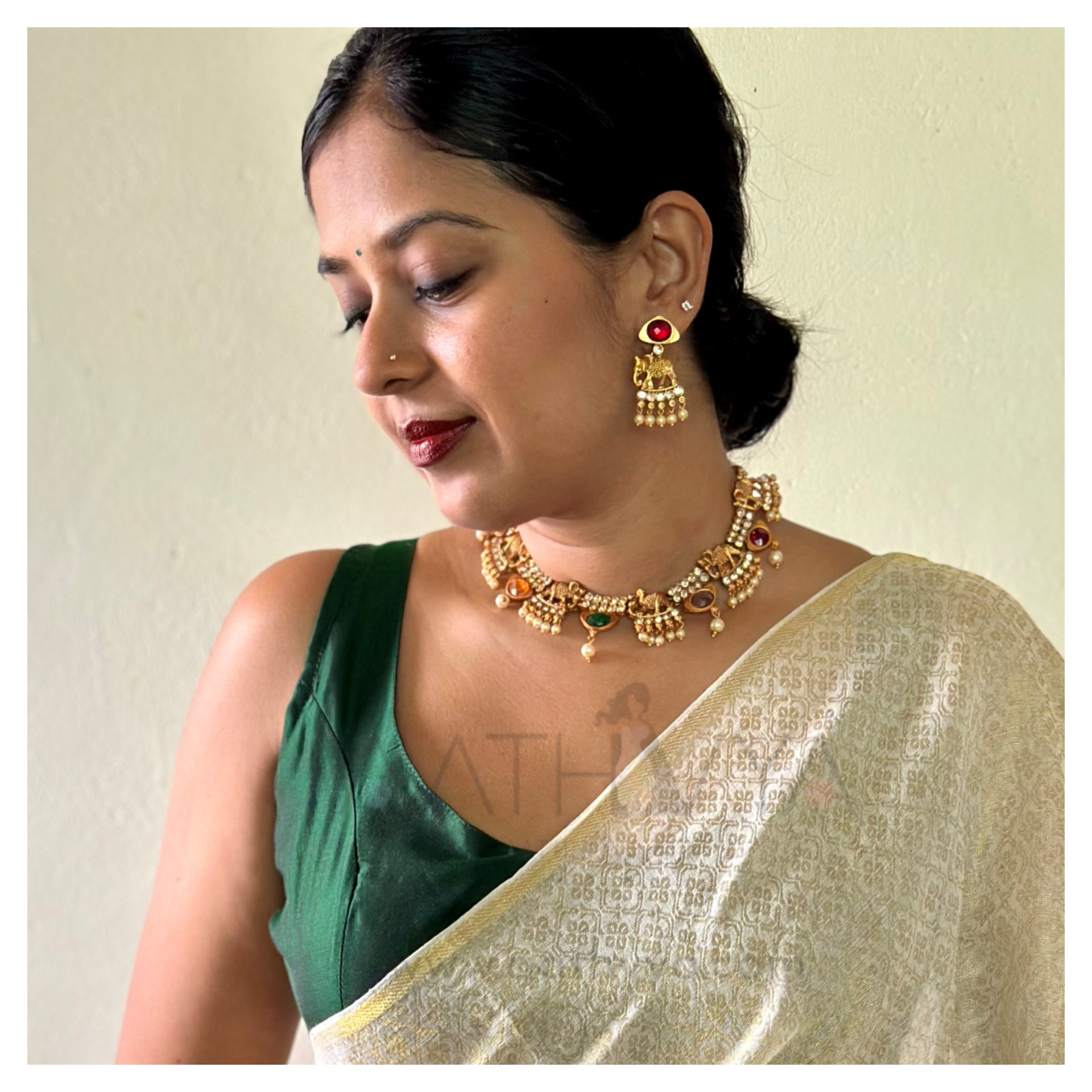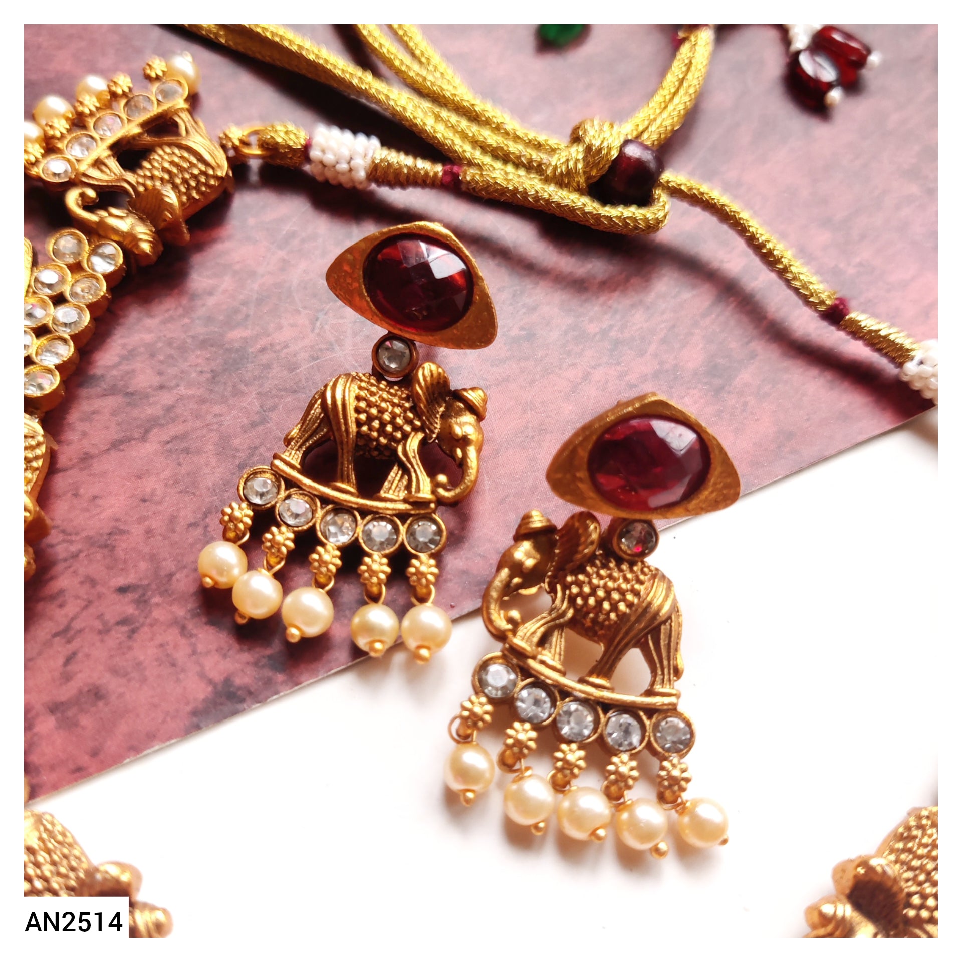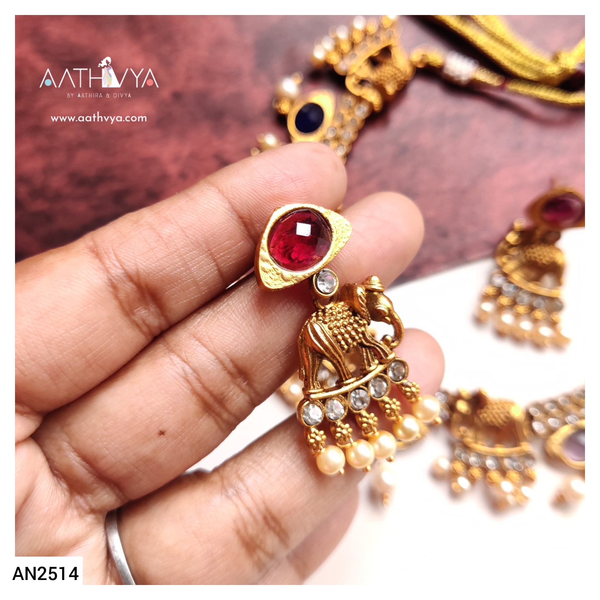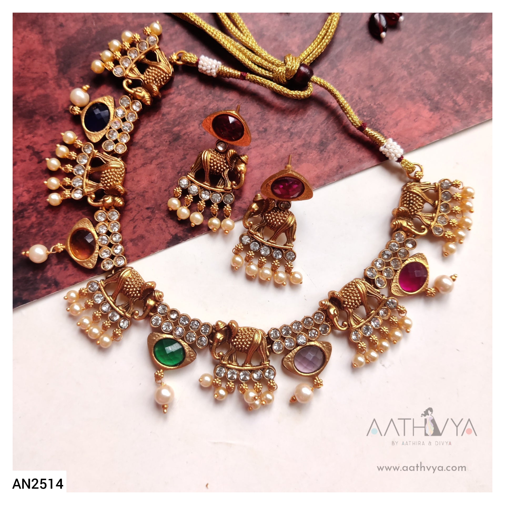 This festive season, adorn yourself with this matte finish, multicoloured stone & off-white pearl bead embellished, intricately handworked, elephant designed necklace set.