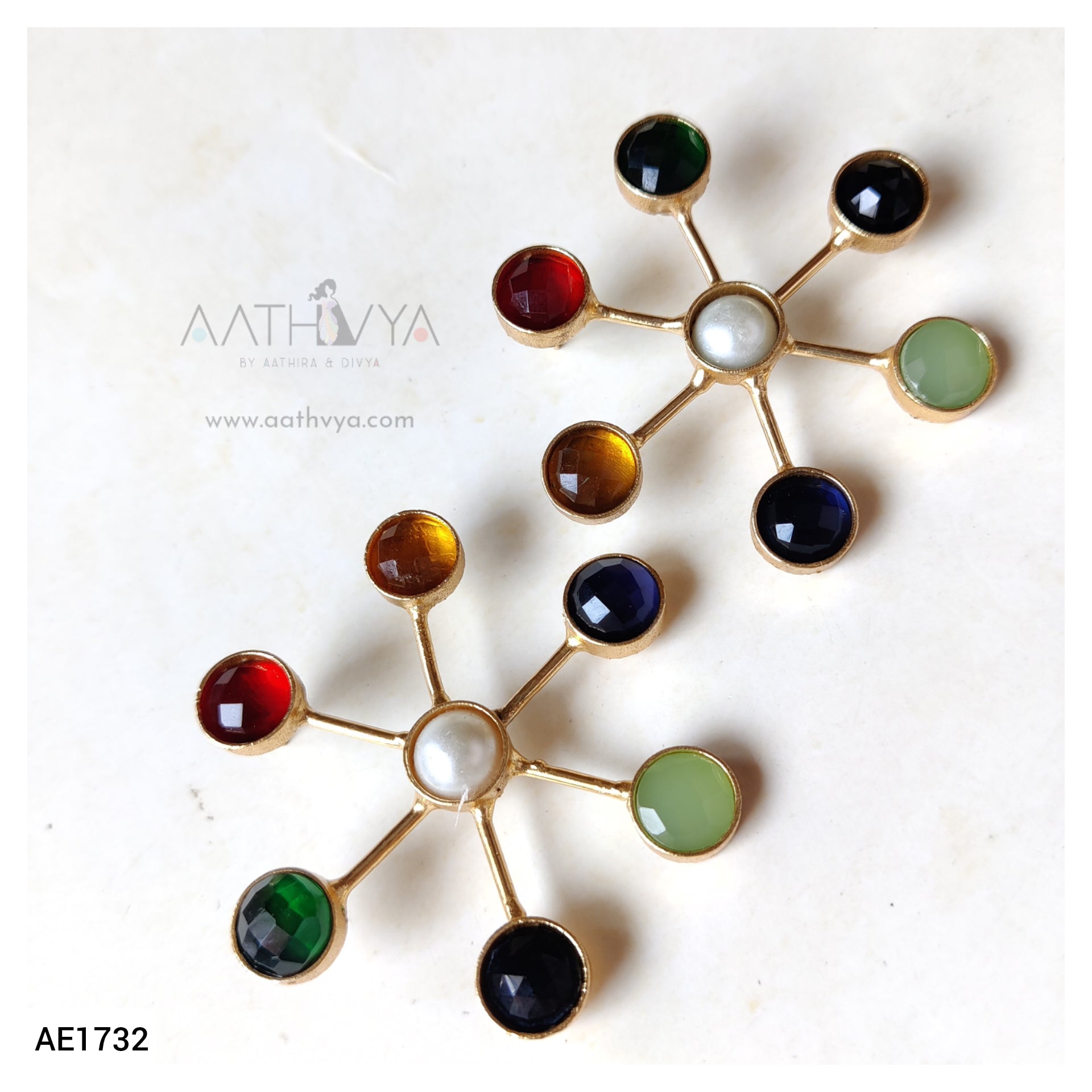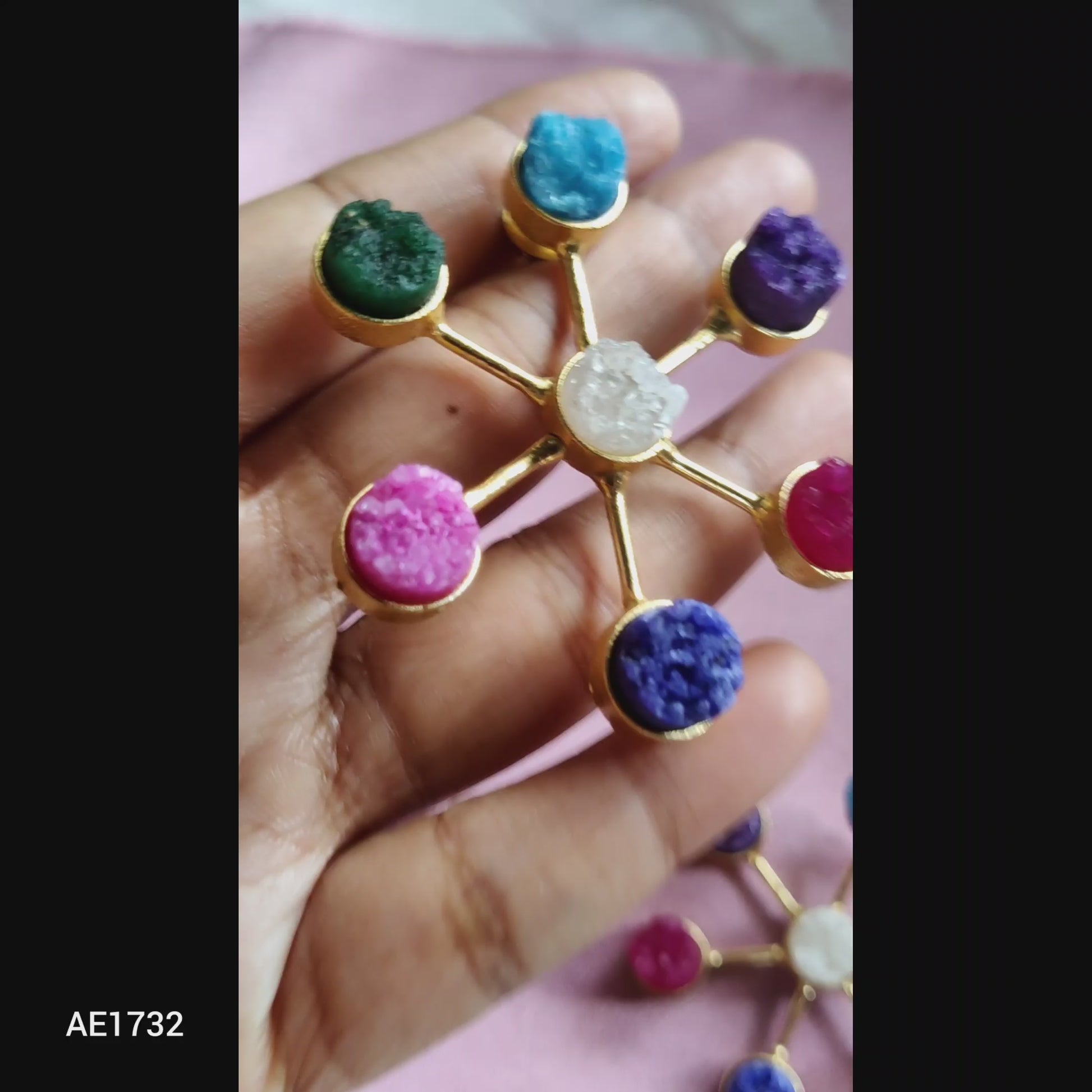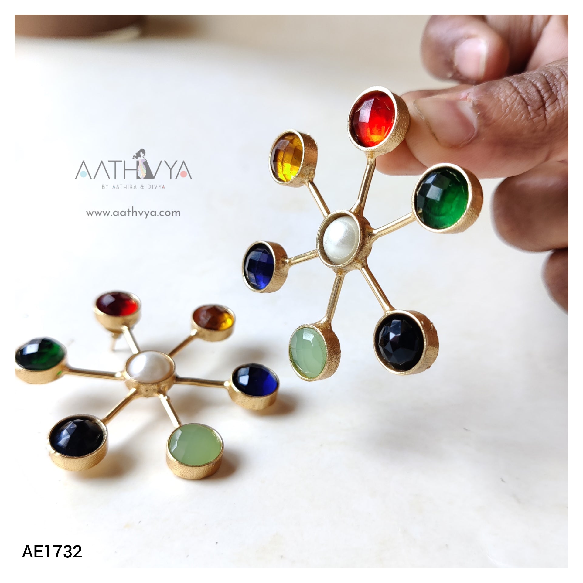 These contemporary stellar snowflake shaped earrings in brass embellished with stones are a statement piece in itself.