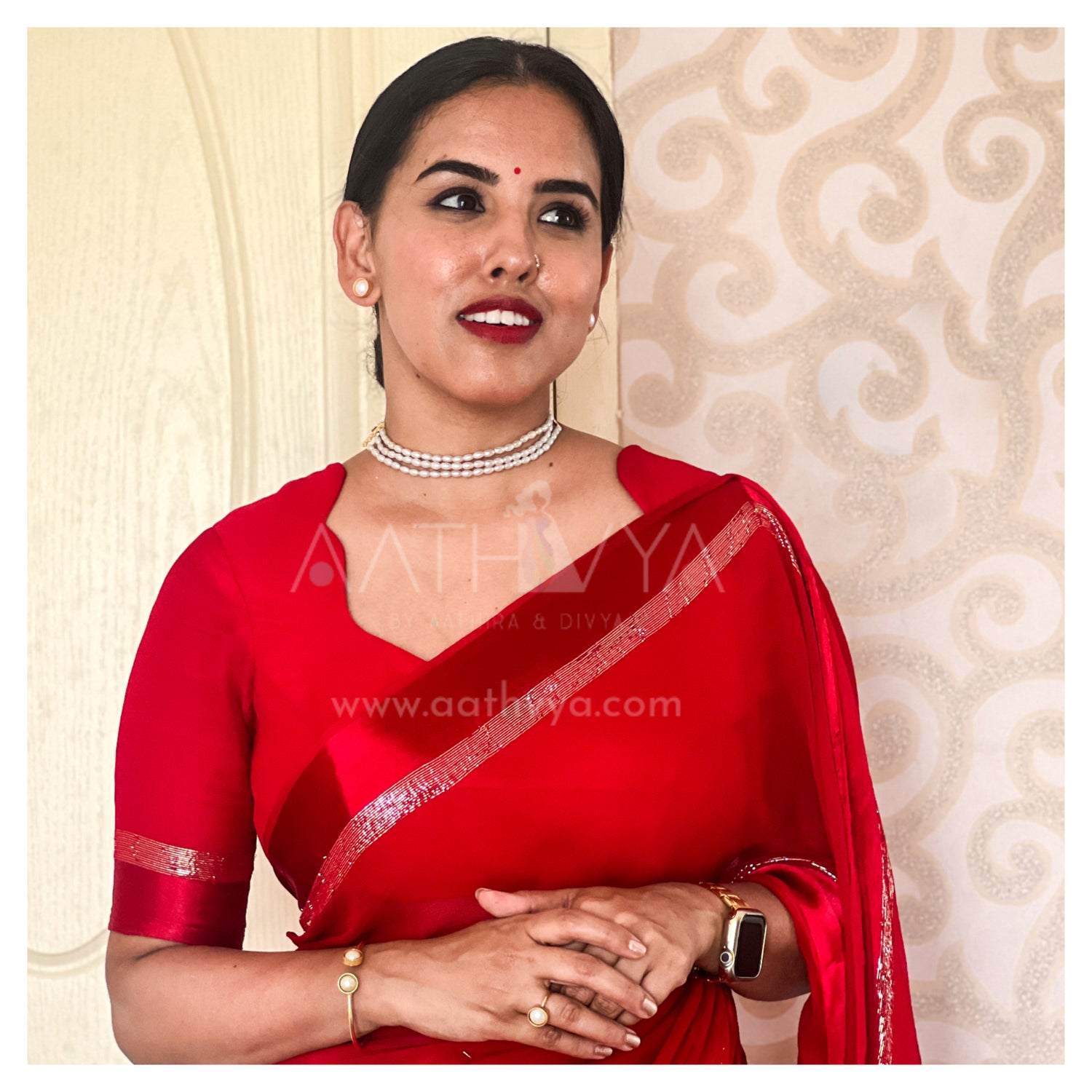Fashion influencer, Amitha Jobin, adorns classy pearl choker and an adjustable pearl...