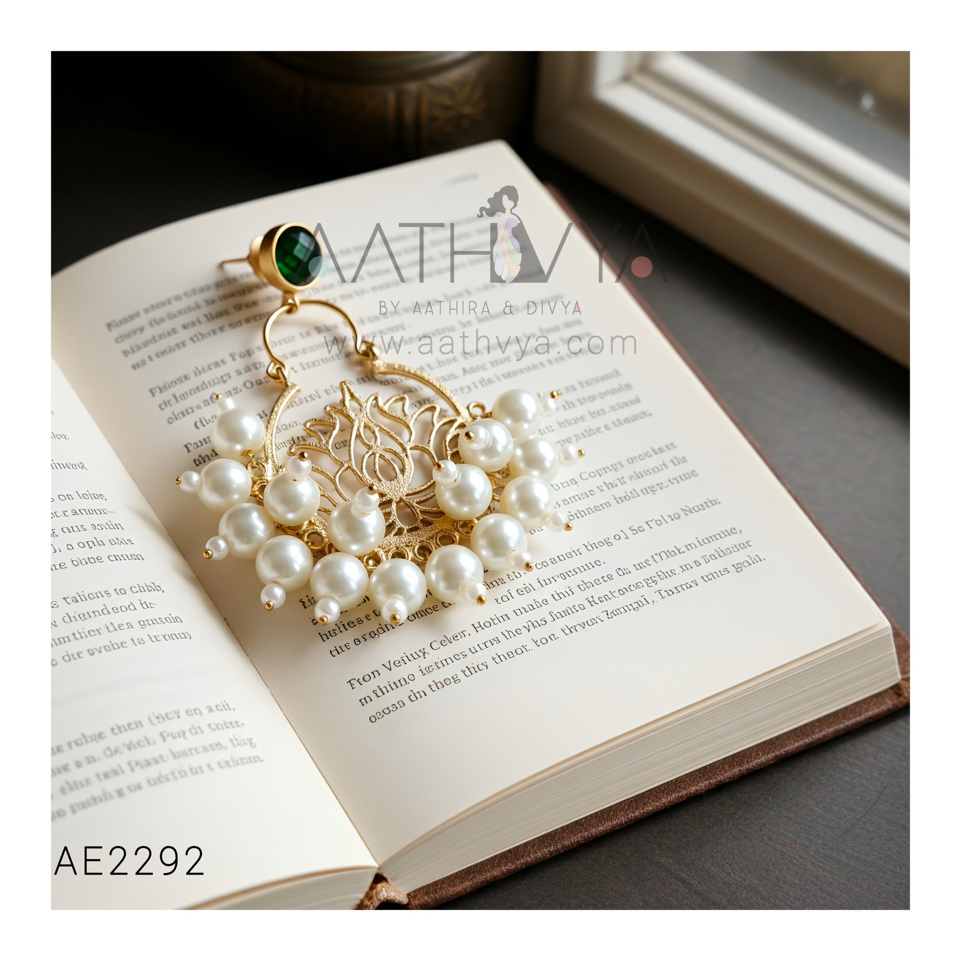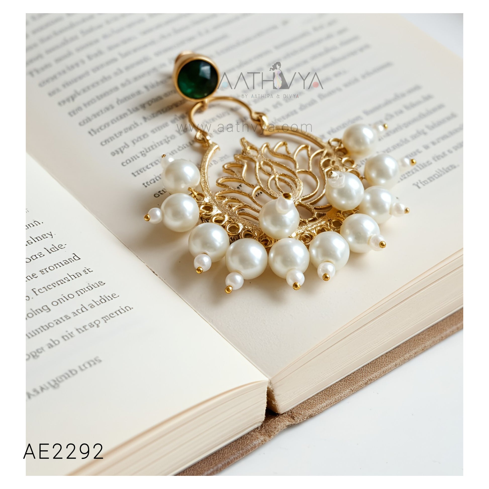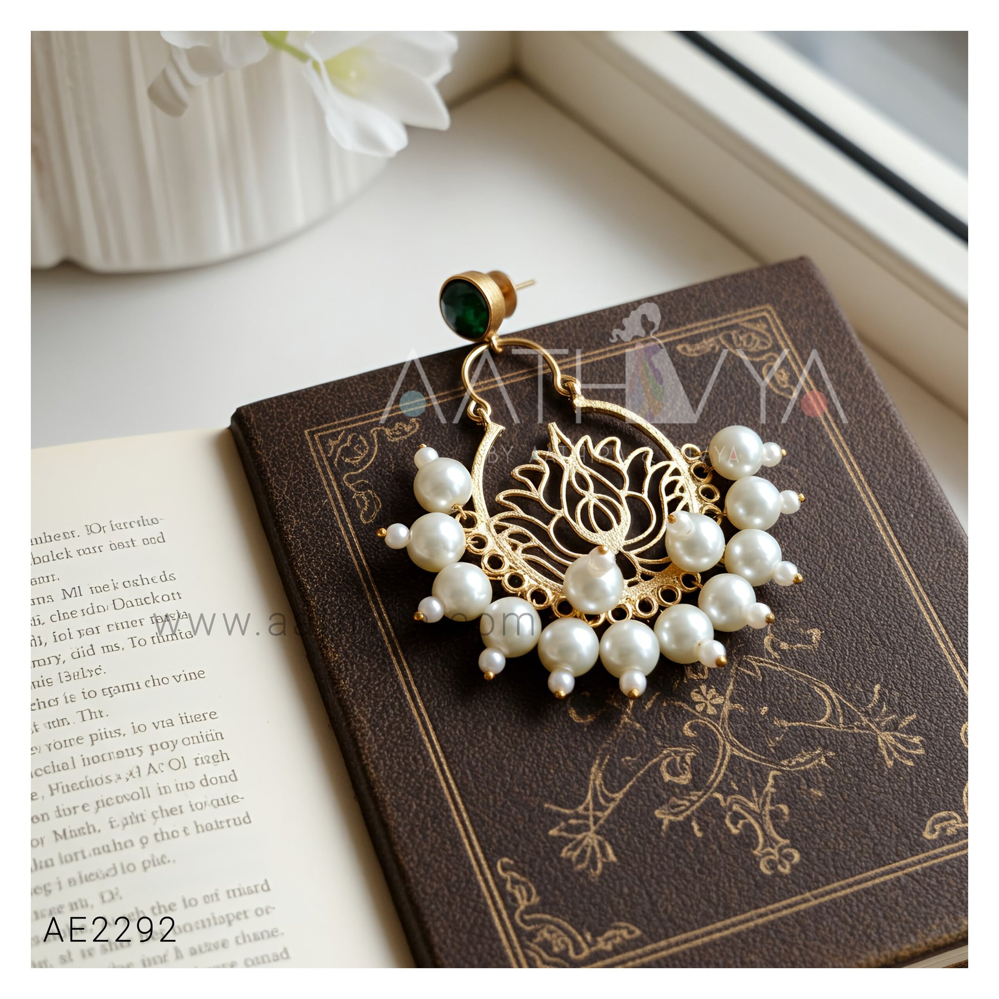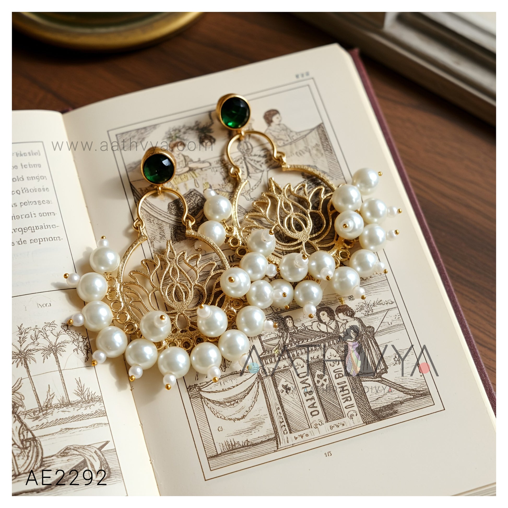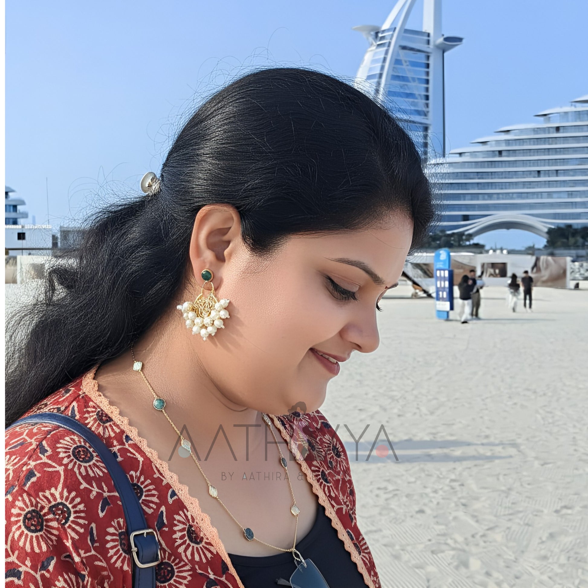 These long stone/pearl studded pearl bead embellished, intricately handworked brass statement chandbalis are your go to accessory this festive season.