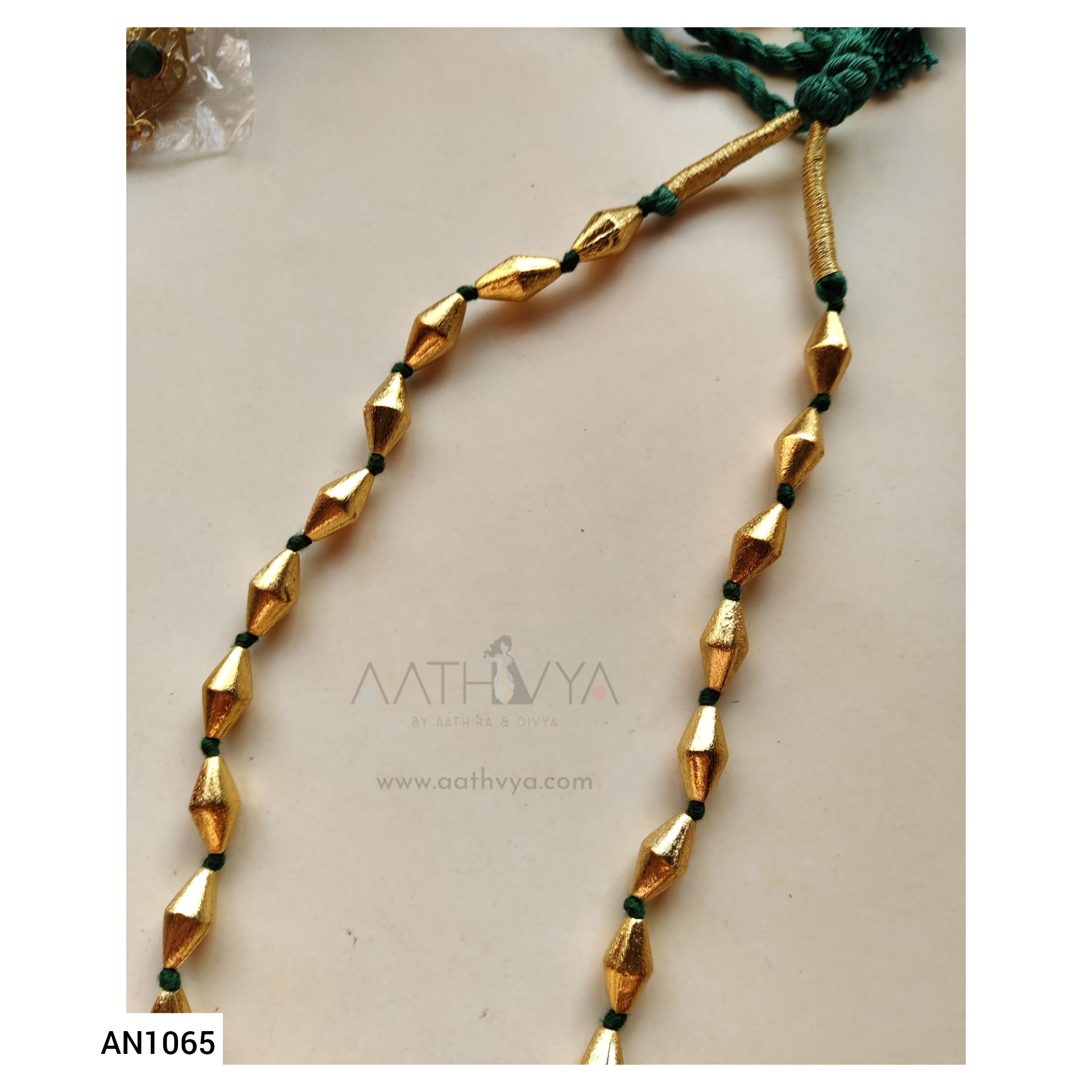 German silver, gold toned single layer dholki neckpiece with a dark green adjustable thread at the back.