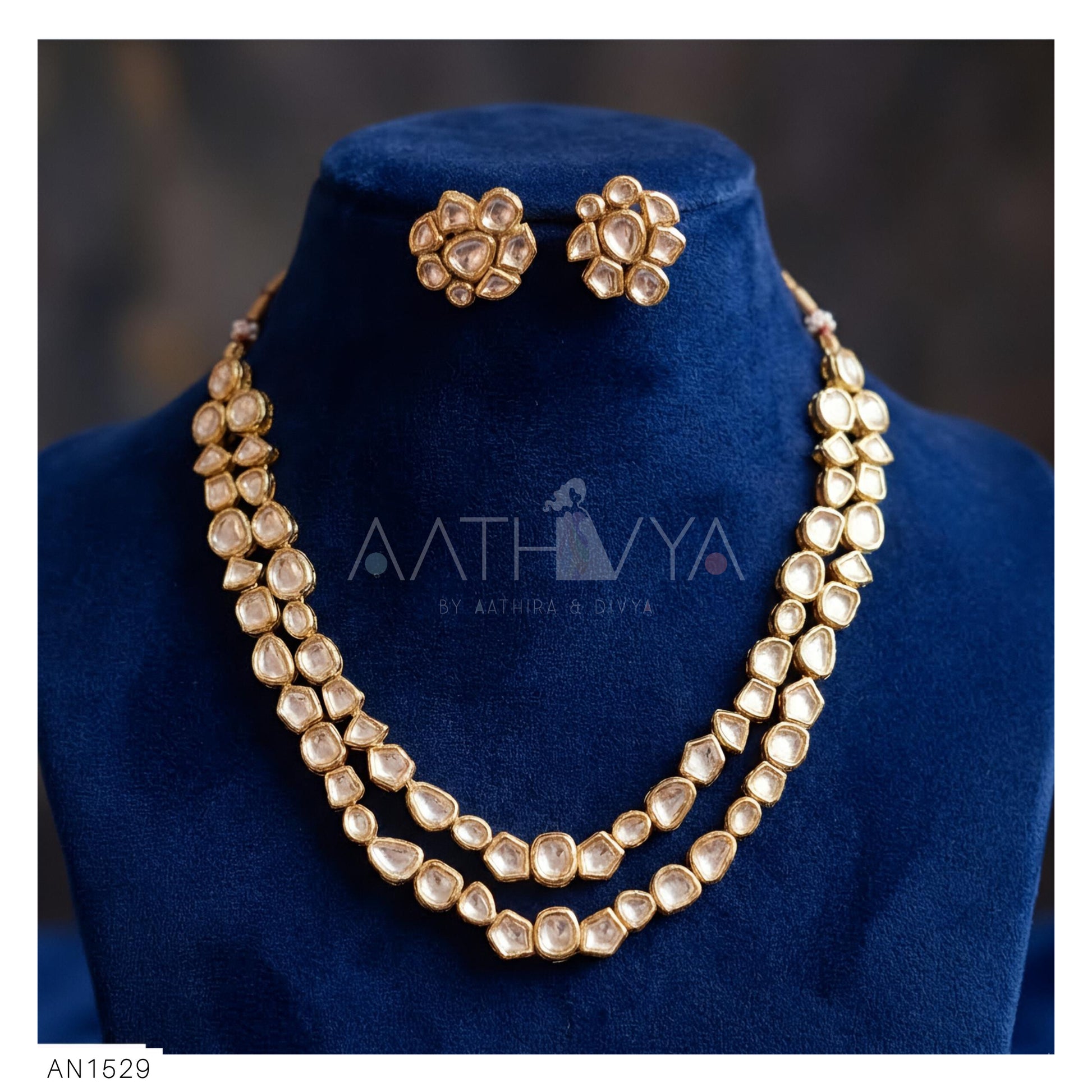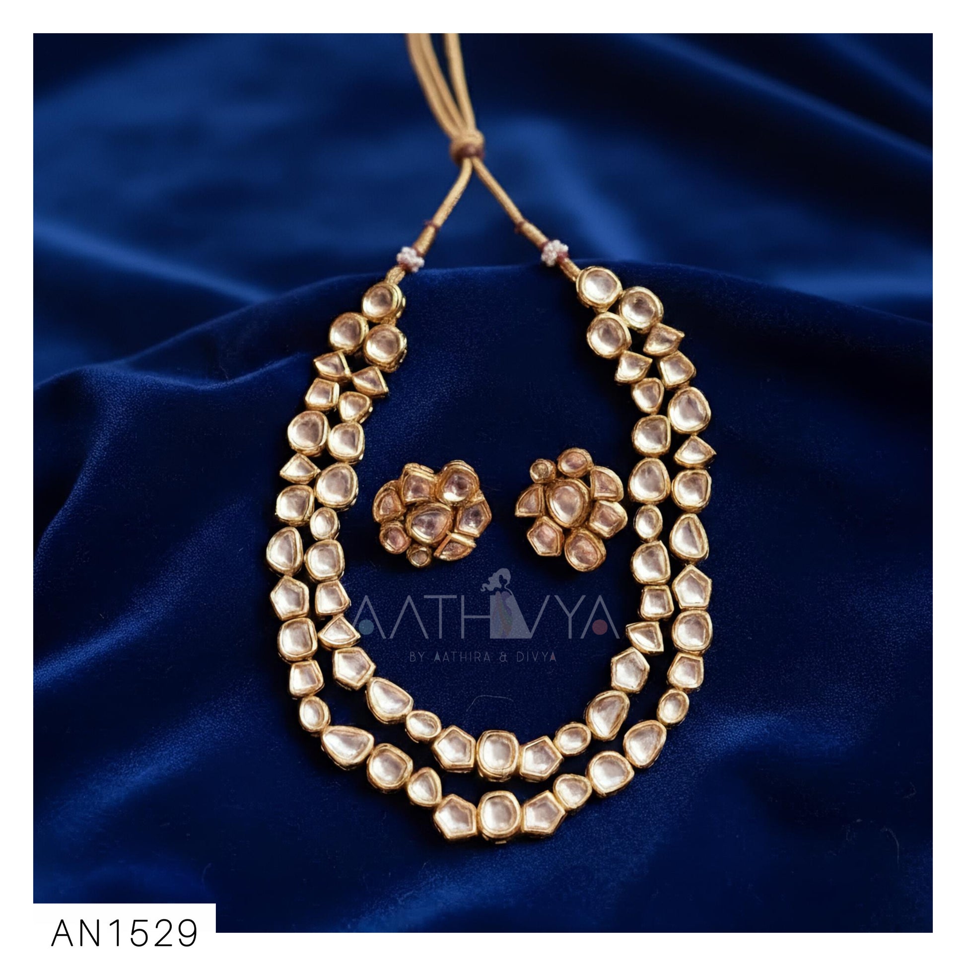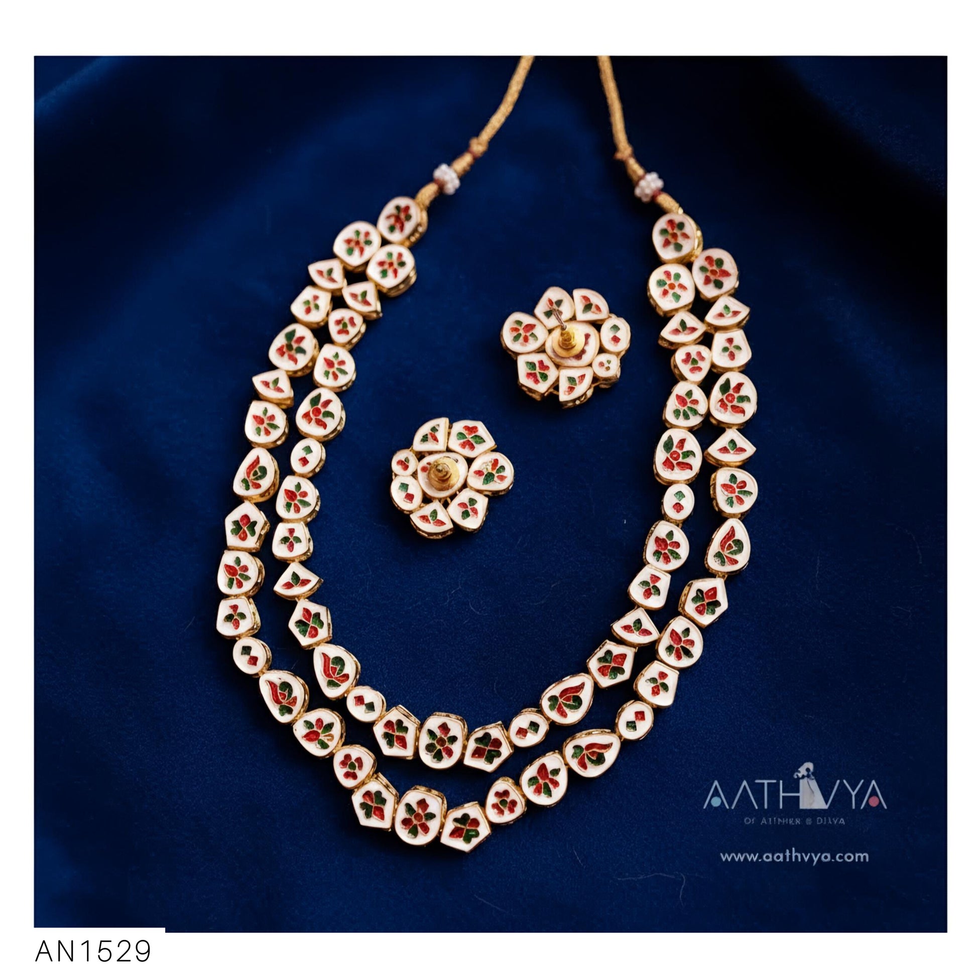 Synthetic, polki kundan, two layer neckpiece with matching studs. The set has meenakari work at the backside. Neckpiece is length adjustable