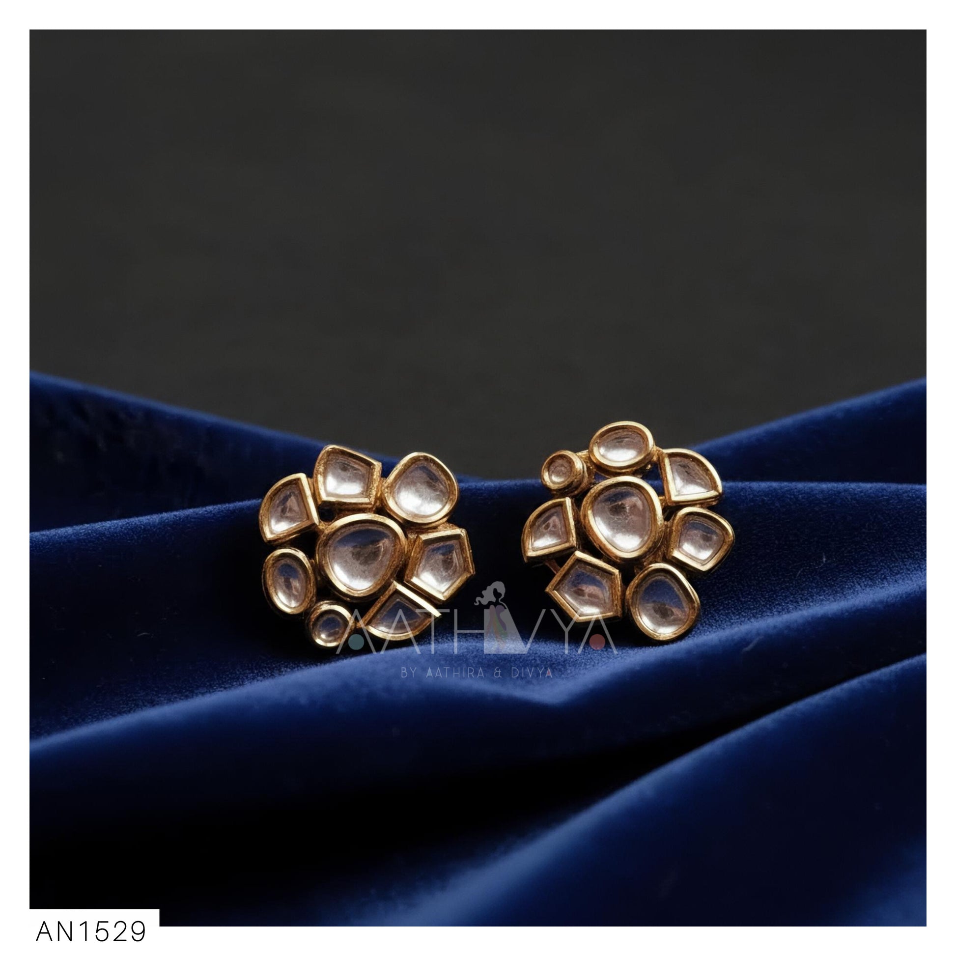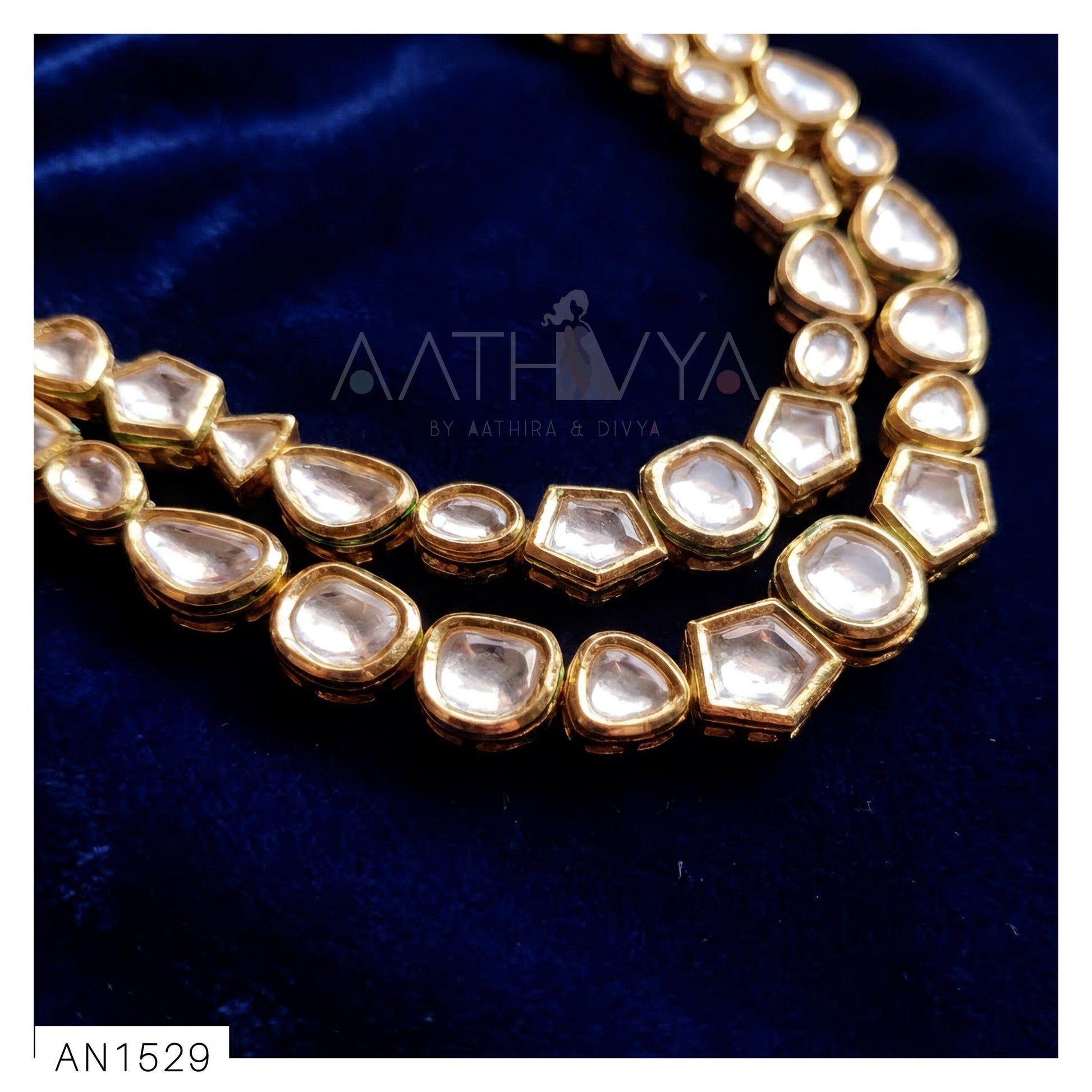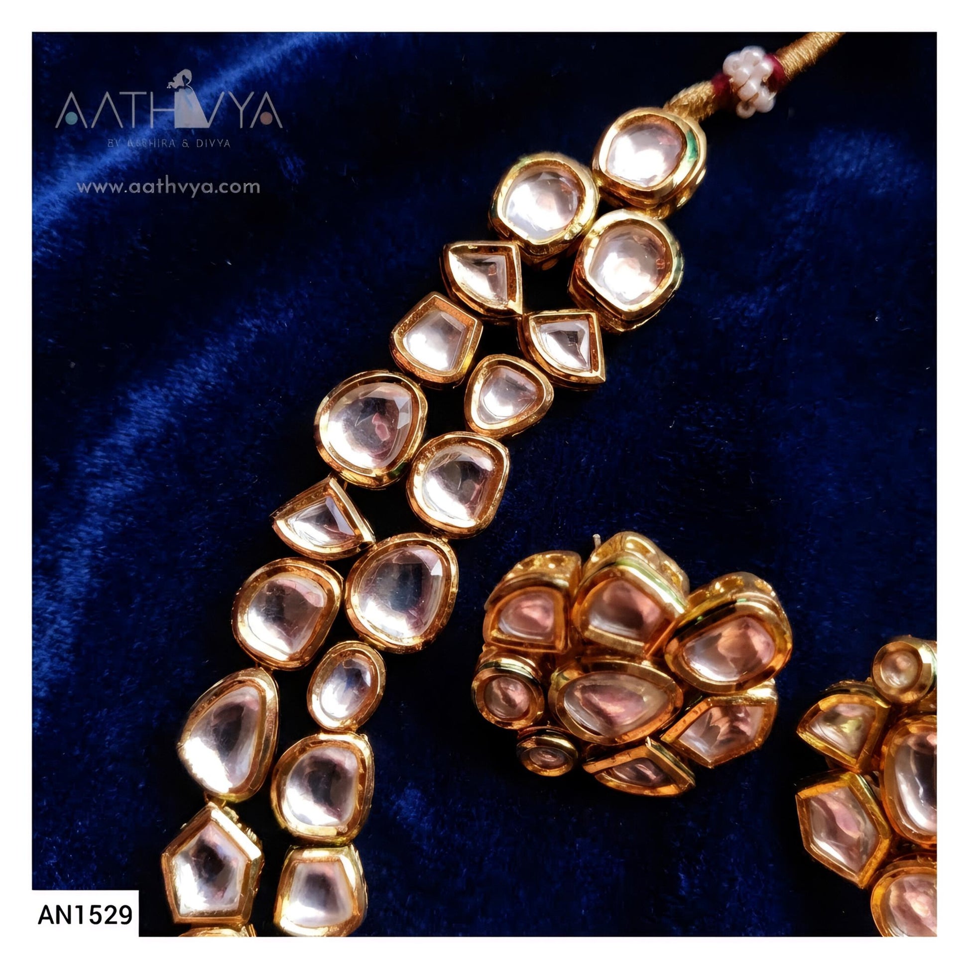 Synthetic, polki kundan, two layer neckpiece with matching studs. The set has meenakari work at the backside. Neckpiece is length adjustable