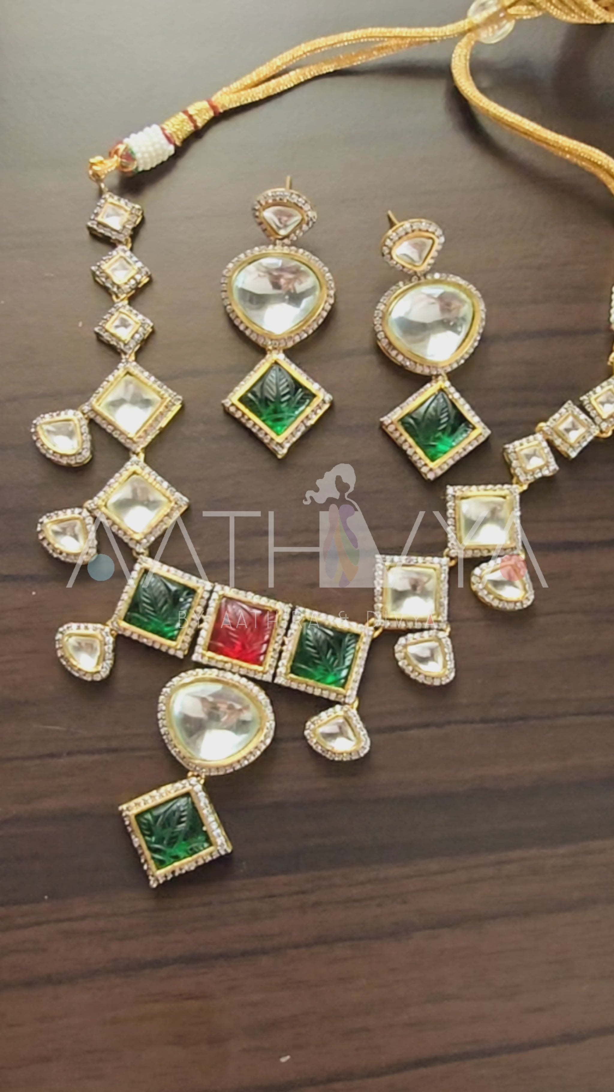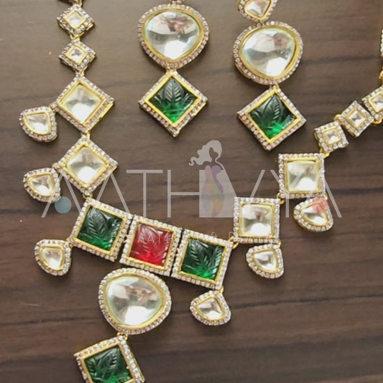 The craftsmanship and the grandeur of the polki, AD and carved stone embellishments on this statement neckpiece set makes it truly a stunner.