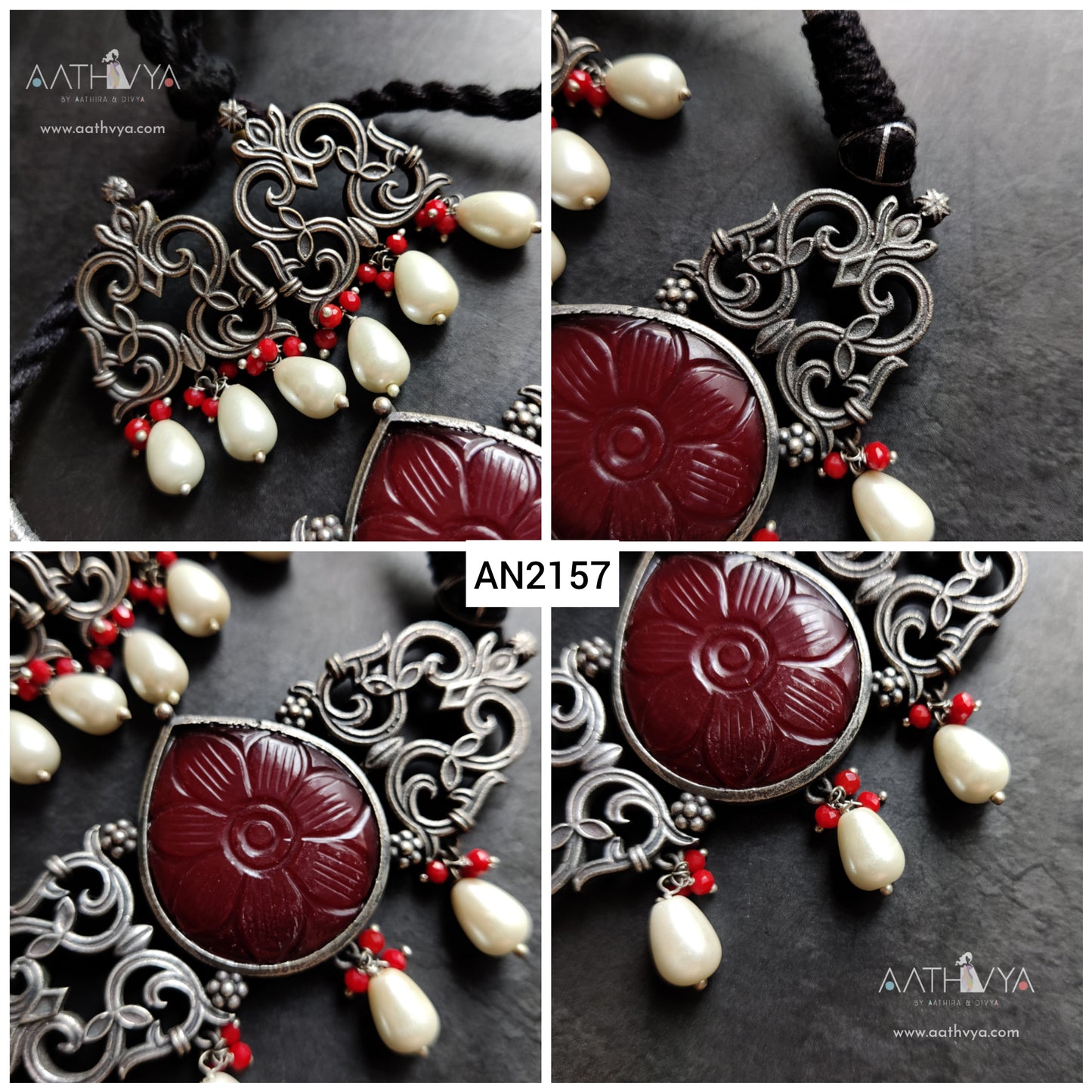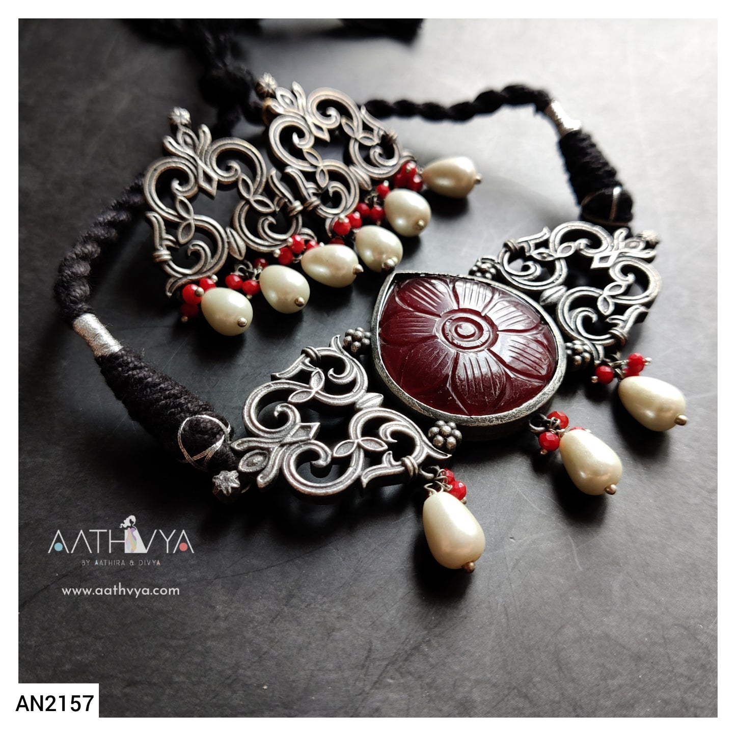 Beautiful, thread adjustable, silver lookalike choker set with carved cabochon studded at its centre and a matching pair of earrings. The set is embellished with pearl beads.