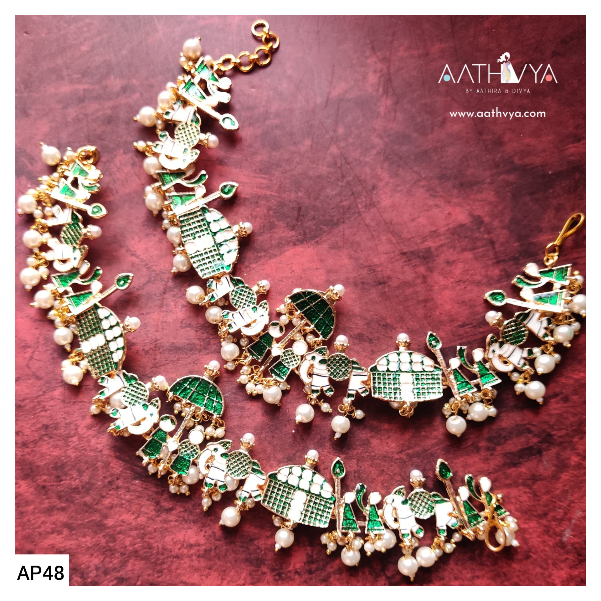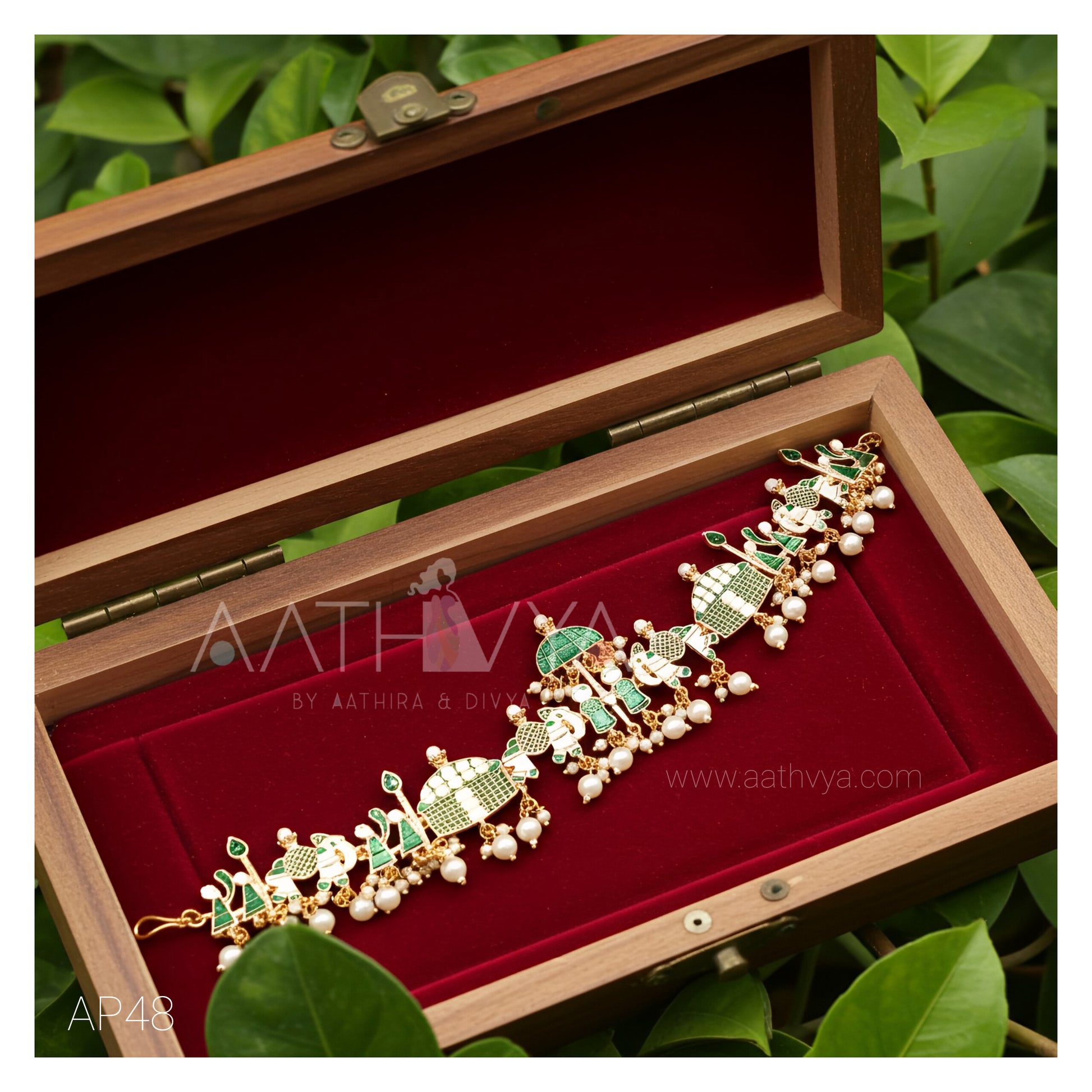 These trending colourful meenakari worked baraat anklets in brass embellished with pearl beads are indeed that perfect accessory to complete your bridal look this wedding season.