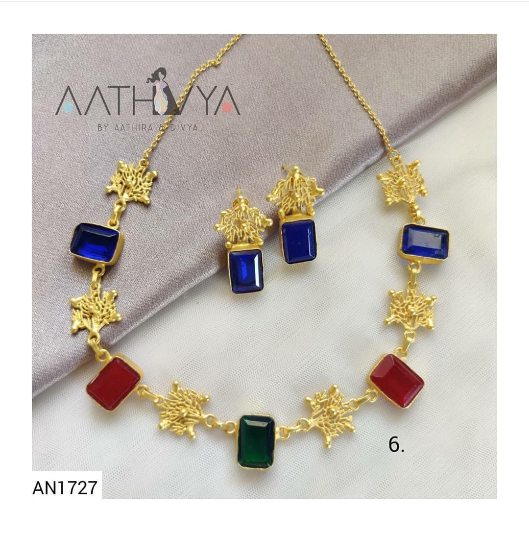 AN1727The trending contemporary styled floral/motif designed brass stone statement necklace set with matching pairs of earrings that will surely make you stand out in the crowd.