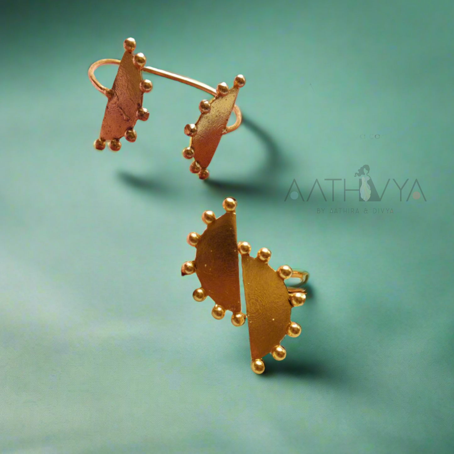Contemporary styled semicircular disc combo set of adjustable handcuff & matching pair of earrings in brass.